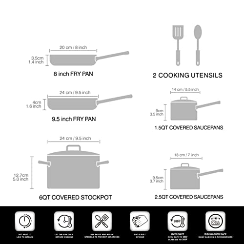 Pots and Pans Set Includes: 1.5 quart and 2.5 quart saucepans with lids, 6 quart stockpot with lid, 8 and 9. 5 in frying pans, a nylon spatula and spoon