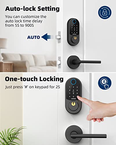 Auto-Lock & One-touch Lock: Zomnua keyless entry door lock can set to be locked automatically in 5-900s after the door closed, to ensure your home security while you leave home in hurry. One-touch Lock is to lock the door from outside by pressing and holding pound key on keypad for 2 seconds.