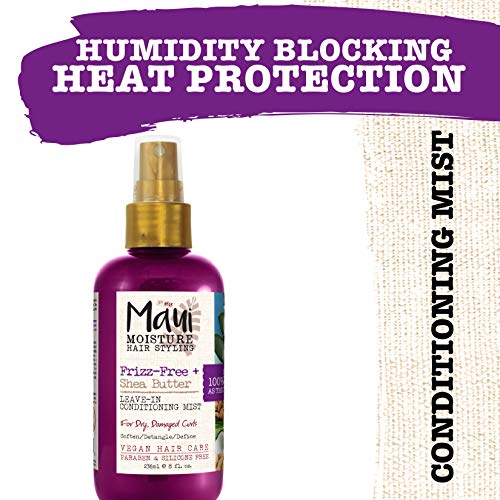 Maui Moisture Frizz-Free + Shea Butter Leave-in Conditioning Mist is a vegan, silicone-free blend crafted with 100% aloe vera as its first ingredient and infused with shea butter, coconut oil and macadamia oil to keep frizz at bay and coils hydrated and feeling soft all day long. This easy-to-use product helps protect against heat while defining your curls to enhance their natural beauty. Just spray it evenly on damp hair, style and go. We believe in the power of nature—that’s why this product is vegan and free of silicones, parabens and mineral oil.