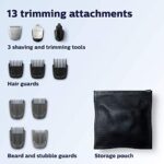13 attachments for all of your grooming needs: Full size steel trimmer, a steel precision trimmer, a nose and ear hair trimmer, 3 hair trimming guards, 3 beard trimming guards, a stubble guard, an accessory travel storage bag, and a cleaning brush. Unlike competition, no oil needed to maintain high quality performance Blades and Guards are easy to detach and rinse